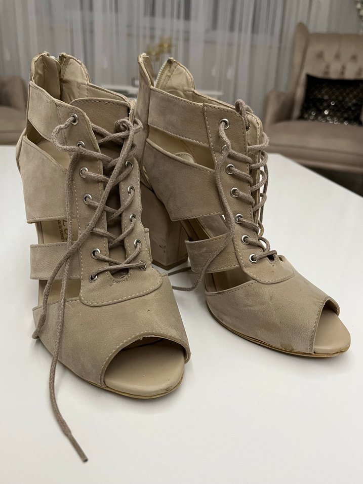 Bej süet malzemeden yapılmış, bağcıklı ve tokalı kadın dolgu topuklu ayakkabı. Günlük kullanım için çağdaş tarza uygun, desensiz model.