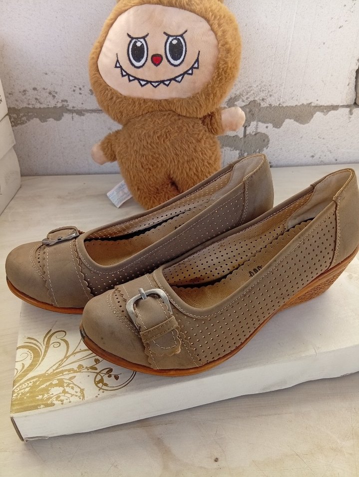 Bej süet malzemeden yapılmış, tokalı dolgu topuklu kadın babet. Günlük kullanıma uygun, sade ve desen içermeyen tasarım. Marka temsilidir.