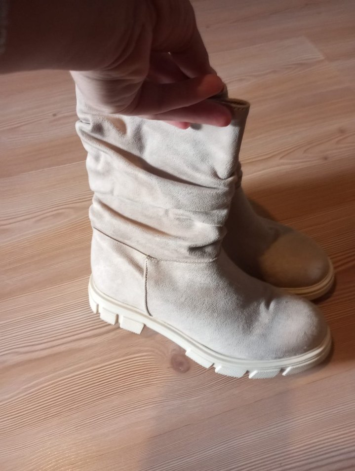 Bej süet kadın botları, dolgu topuklu, rahat ve şık tasarımıyla günlük sokak stili için uygundur.