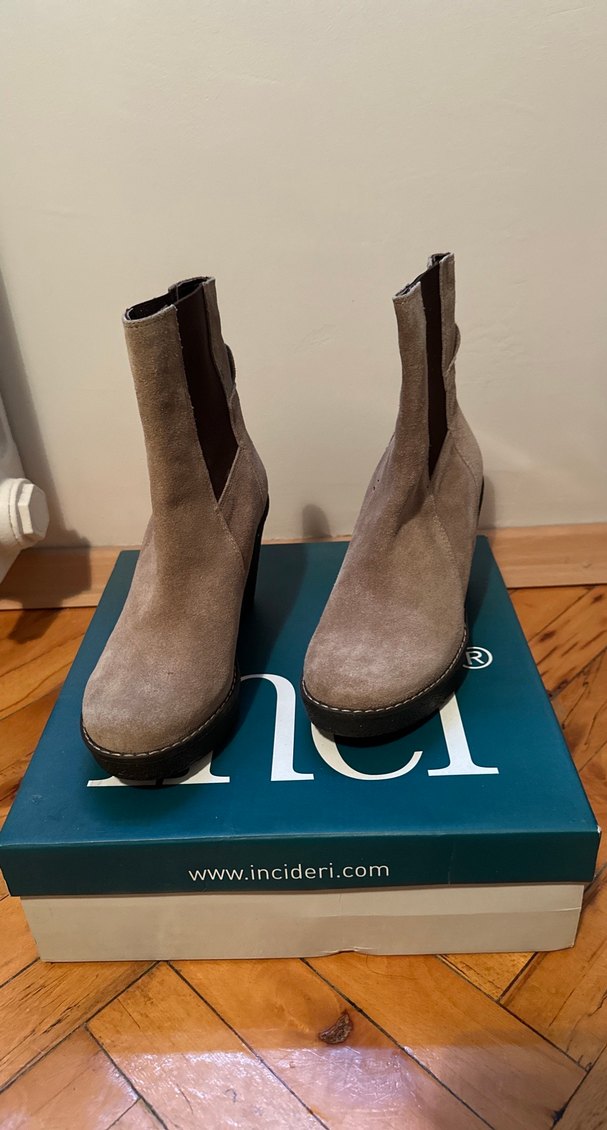 Bej süet kadın botları, dolgu topuklu