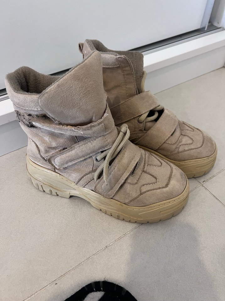 Bej süet kadın botları, dolgu topuklu ve tokalı kayışlara sahip. Günlük sokak stili için rahat ve trend görünüme uygun.