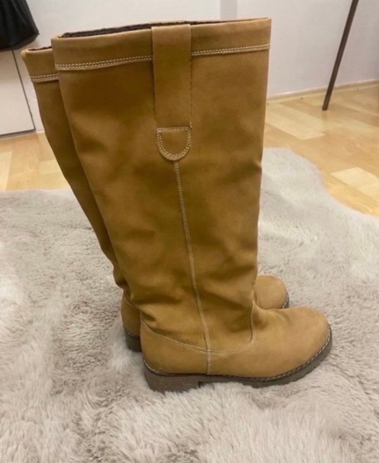 Bej süet diz boyu çizme, dolgu topuk ve kemer detayına sahip, rahat ve bohem tarz için uygun.