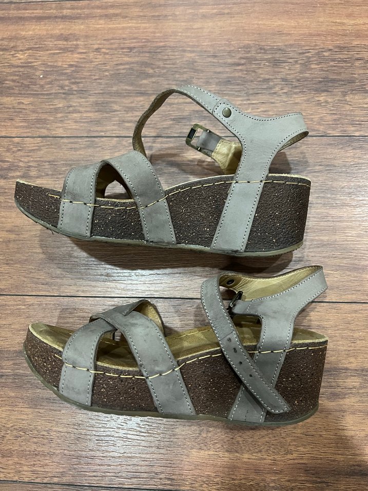 Bej süet kadın sandalet, dolgu topuk ve tokalı kayışlar içerir. Bohem ve minimalist tarzı günlük kullanım için uygundur.