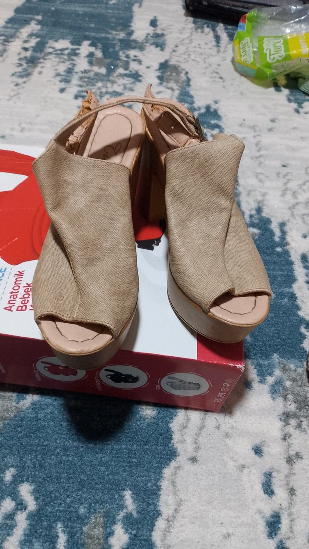 Bej süet malzemeden yapılmış, tokalı ve desenli kadın dolgu topuklu sandalet, günlük ve sokak stiline uygundur.
