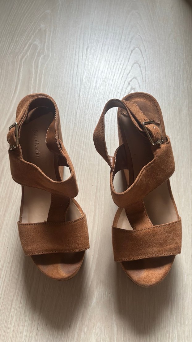 Bej süet kadın dolgu topuklu sandaletler, tokalı detaylıdır. Minimalist ve parlak yapısıyla günlük bohem tarzına uygundur.