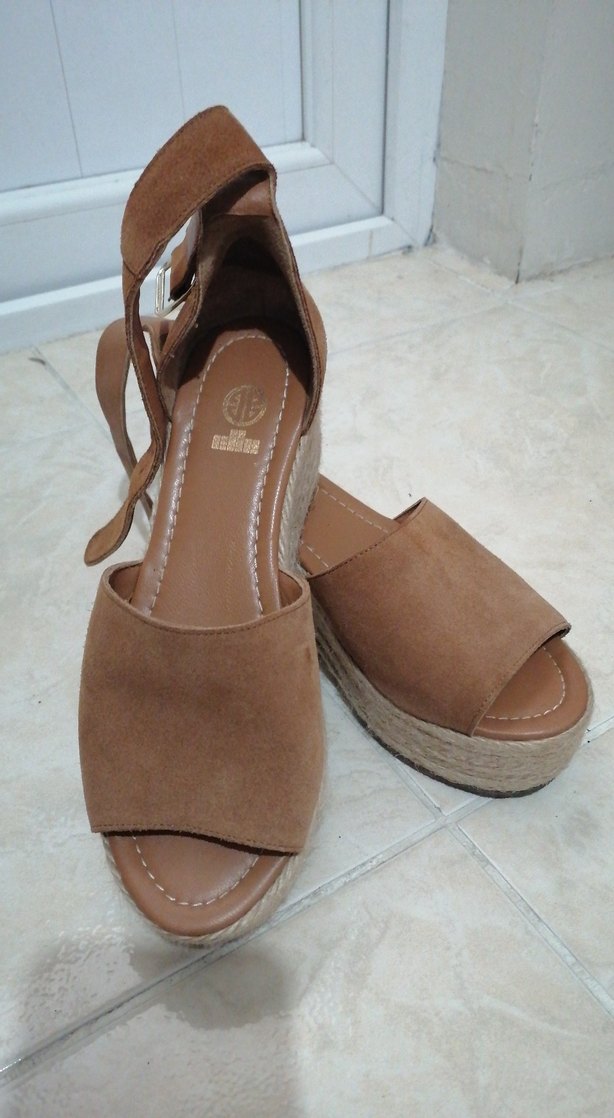 Bej süet malzemeden, tokalı kayışlı, minimal ve bohem tarzda kadın dolgu topuklu sandaletler. Günlük kullanıma uygundur.