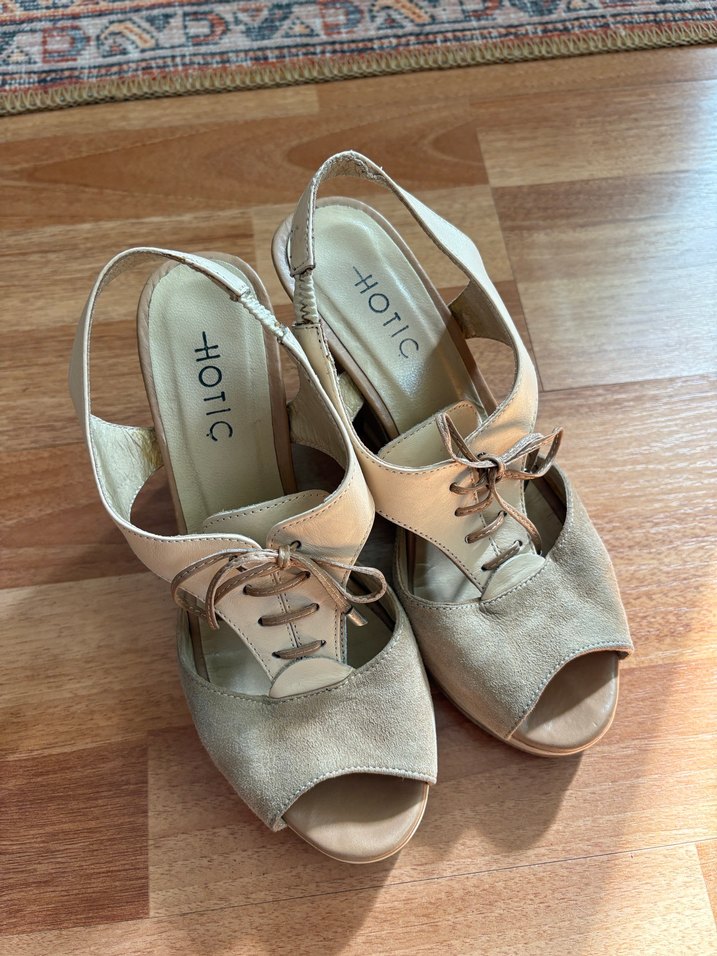 HOTIC markalı bej süet dolgu topuklu kadın sandalet, tokalı ve bağcıklı tasarıma sahip. Vintage tarz ve romantik buluşmalar için uygun.