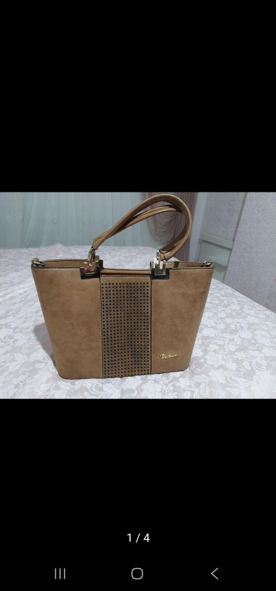 Bej süet malzemeden yapılmış, kemer detaylı ve parlak görünümlü kadın el çantası. Minimalist ve çağdaş tarzda, günlük kullanıma uygun. hiç kullanılmadı etiket yok