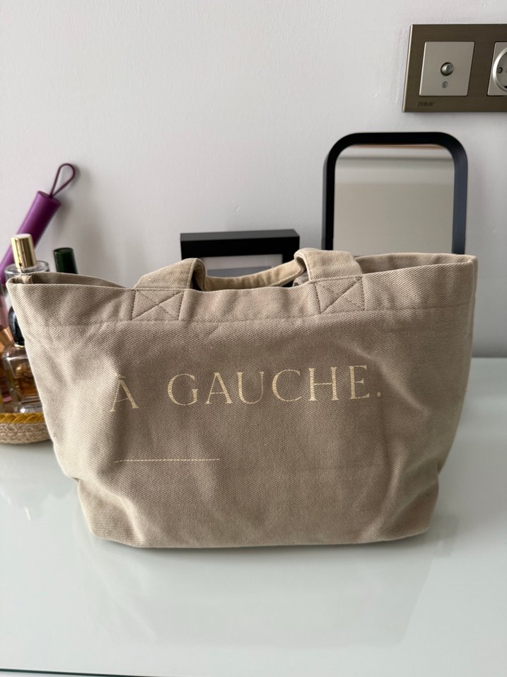 Bej süet kadın el çantası, 'GAUCHE' yazılı baskılı desene sahiptir. Parisli bohem stilini günlük kullanıma uygun rahat şıklıkla birleştirir. Beymenden aldım