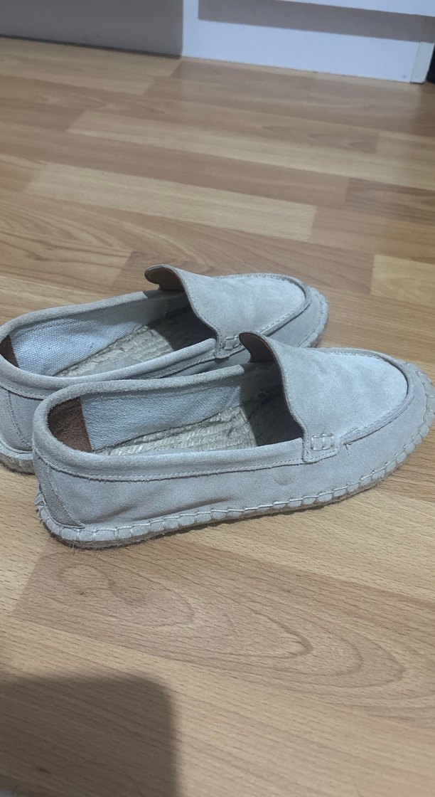Bej süet espadril, düz tabanlı, minimalist ve bohem tarzda, rahat günlük kullanım için desen içermeyen şık tasarım.1 kez kullanıldı