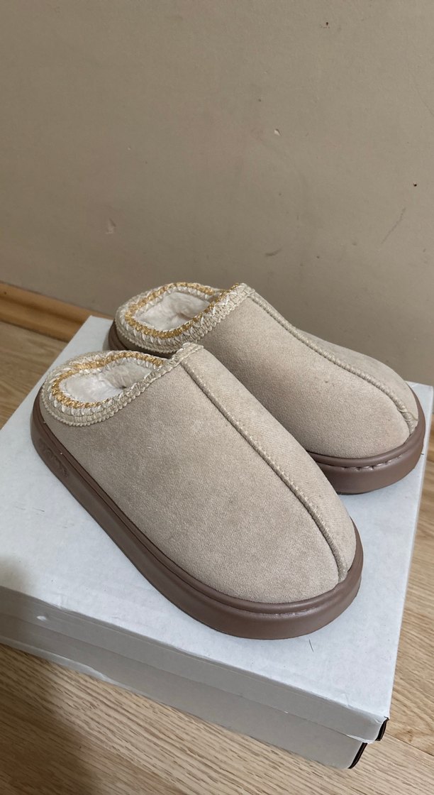 Bej süet kadın ev terliği, dolgu topuklu ve kürk detaylıdır. Düz ve desensiz tasarımıyla günlük kullanıma uygundur. 40-41 numara yazıyor ancak kalıbı dar. Ben 38 giymeme rağmen bana oluyor.