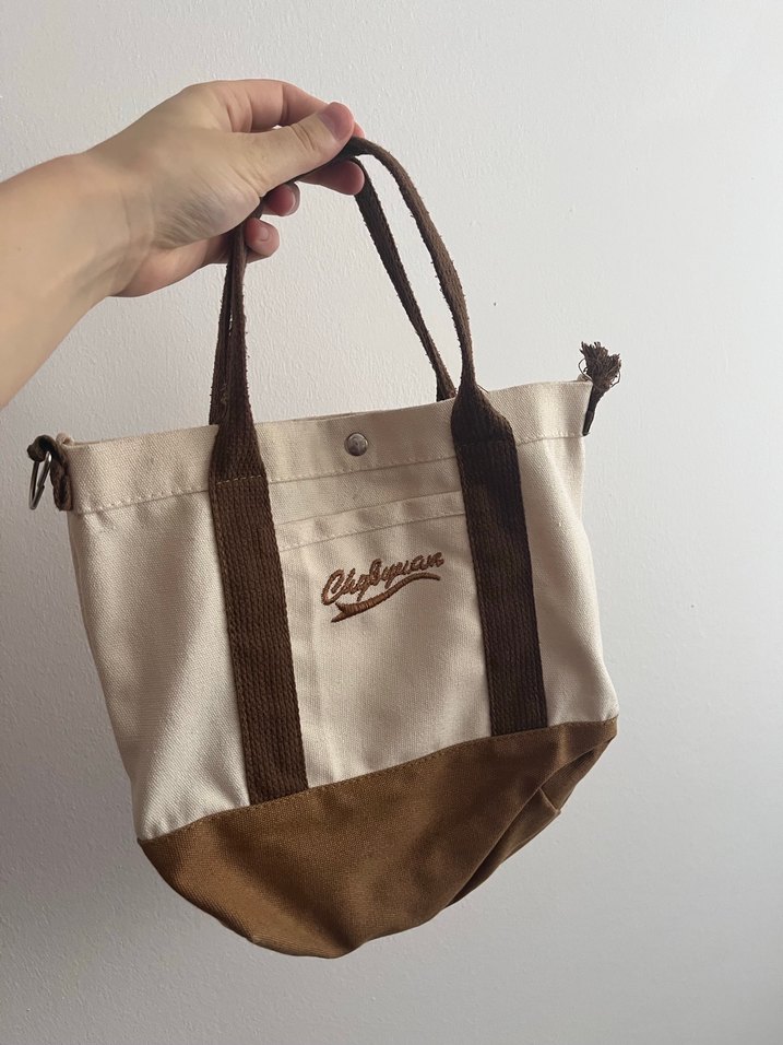 Bej süet malzemeden kadın çantası, kahverengi saplar ve taban, baskılı logo ve çıtçıtlı kapama özelliklerine sahiptir. Günlük sokak tarzı için uygundur.