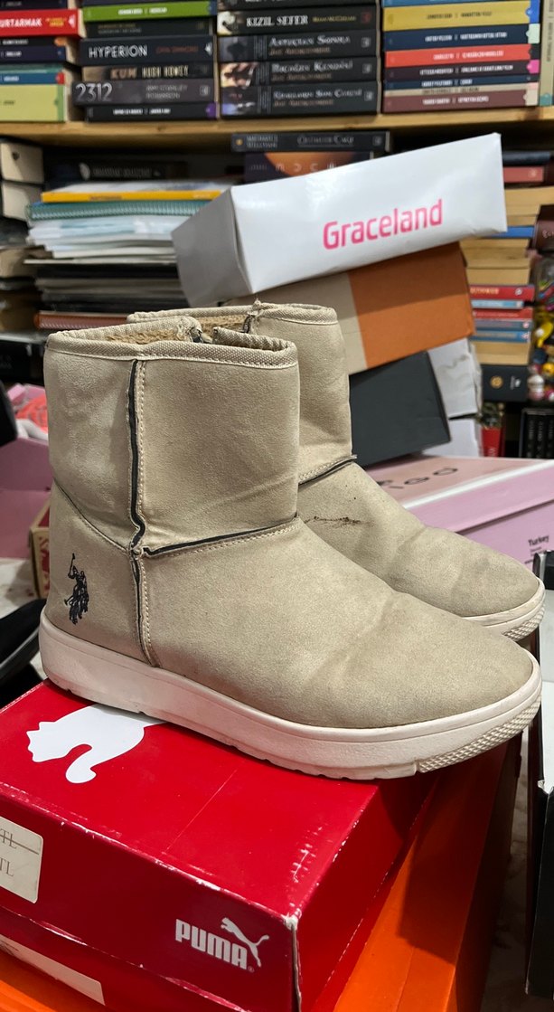 Bej süet kadın botlar dolgu topuklu ve cırt cırtlıdır. Tek renk, rahat tasarımı günlük sokak giyimi için uygundur. Marka: Graceland.
