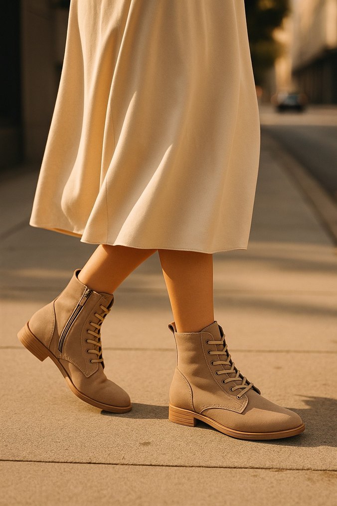 Bej süet malzemeden yapılmış, blok topuklu ve bağcıklı kadın botları. Günlük sokak stiline uyumlu, zahmetsiz şıklık sunar.