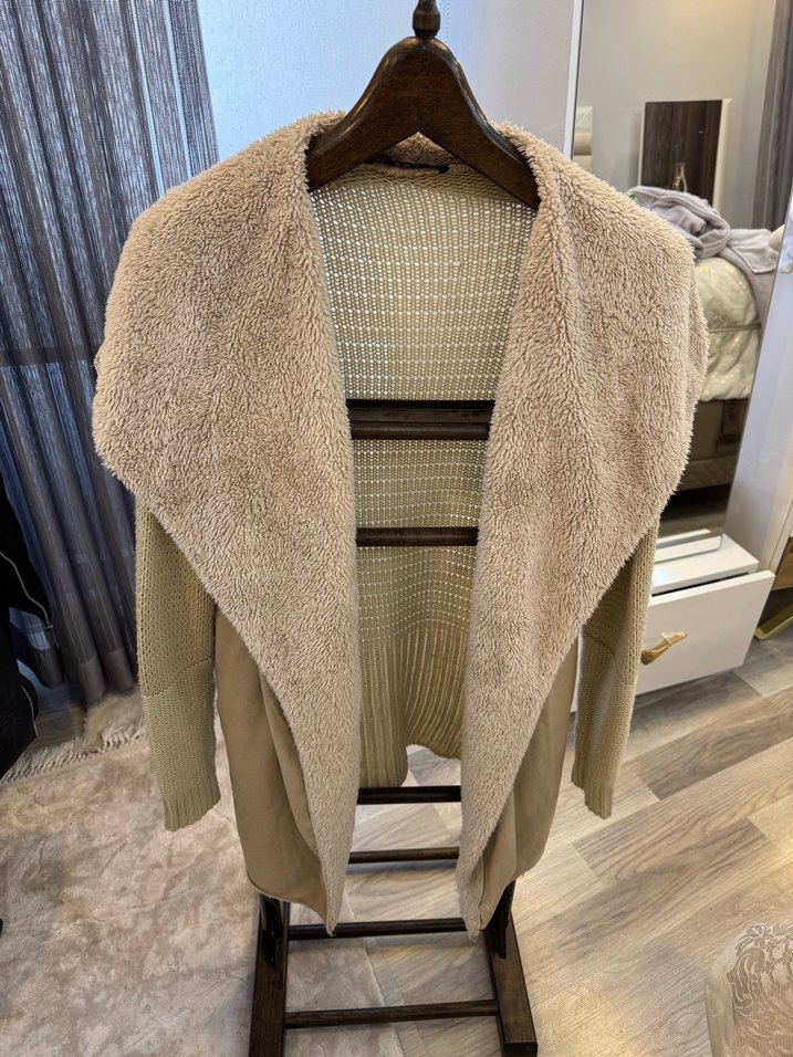 Bej süet kadın hırka, kürklü detaylı ve uzun kollu. Salaş kesimi ve midi boyuyla rahat ve şık bir günlük kullanım seçeneği sunar.
