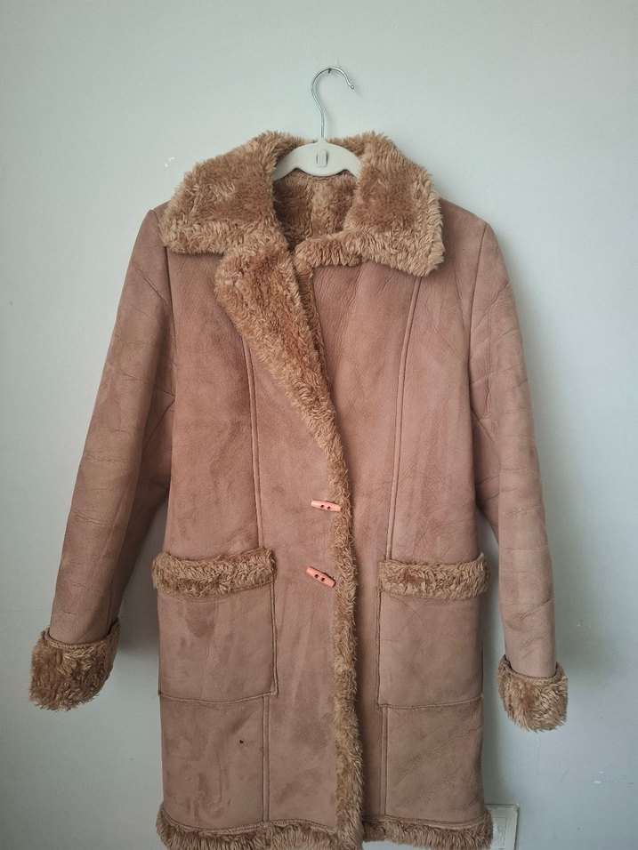 Bej süet kadın kışlık ceket, kürk detaylı yakası, manşetleri ve cepleri ile. Uzun kollu, normal boyda, bohem ve retro tarzda, günlük kullanıma uygun.