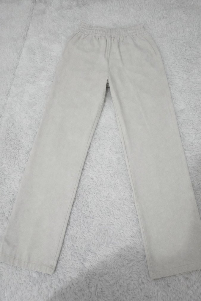 Düz bej renkte, yumuşak süet kumaştan yapılmış, normal kesim ve midi boy kadın pantolon, rahat ve sade bir dış mekan tarzı için uygundur.