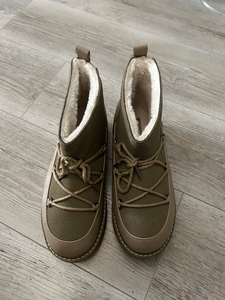 Bej süet kadın botları, kürk detaylı ve dolgu topukludur. Rahat iç yapısı ve bağcıklı tasarımıyla günlük kullanıma uygundur.
