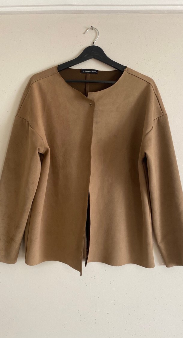 Bej süet kumaştan, parlak görünümlü, uzun kollu, yuvarlak yakalı, düğmeli kadın midi ceket. Rahat kesimiyle minimalist ve trend şıklık sunar.