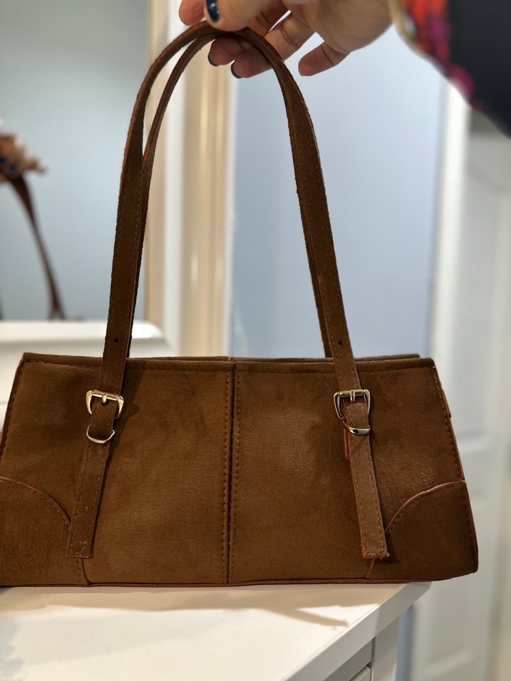 Bej süet malzemeden yapılmış, tokalı ve parlak görünümlü kadın omuz çantası, çağdaş ve klasik Paris tarzını yansıtıyor.