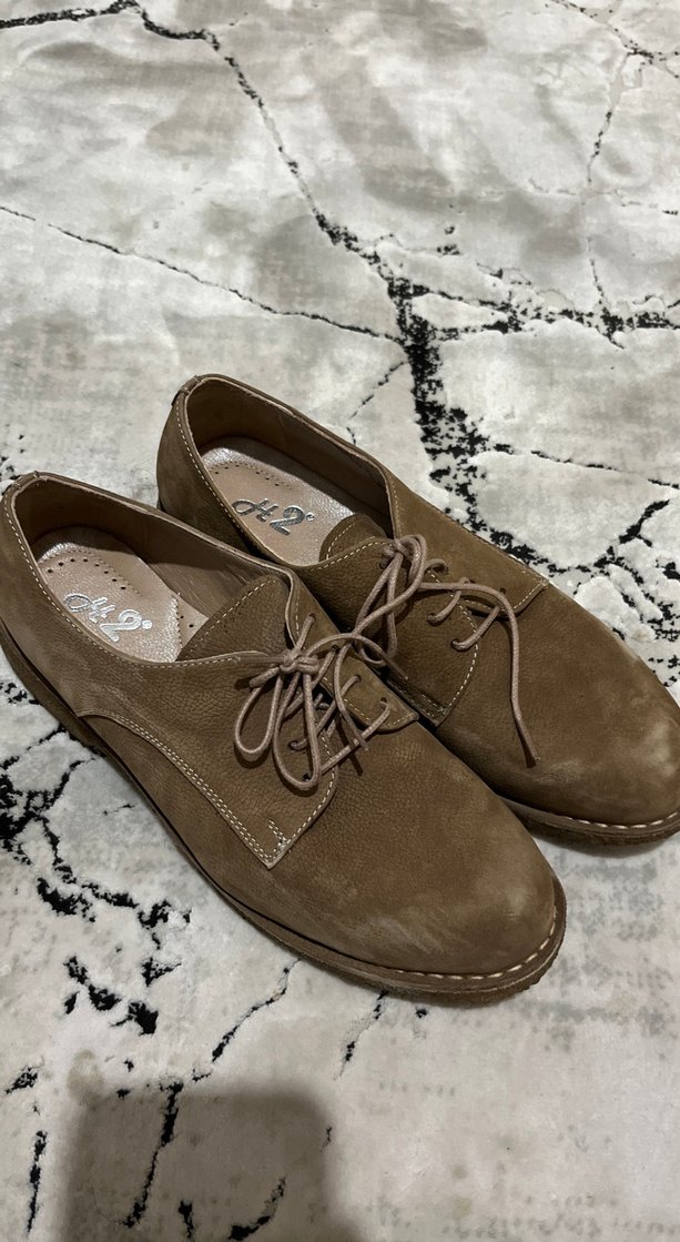 Bej süet kadın oxford ayakkabı, dolgu topuklu ve klasik tarzda, günlük kullanıma uygun rahat ve şık tasarım. Yenidir hiç giyilmedi