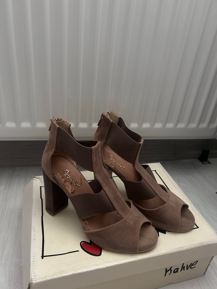 Bambu Bej süet malzemeden yüksek topuklu platform ayakkabılar, tokalı ve baskılı desenli, romantik buluşmalar için uygun.