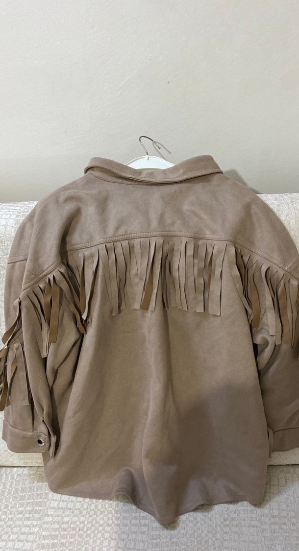 Bej süet kadın ceketin uzun kollu, yakalı ve bol kesimi vardır. Bohem tarzda püskül detayları ve midi boyu bulunur.