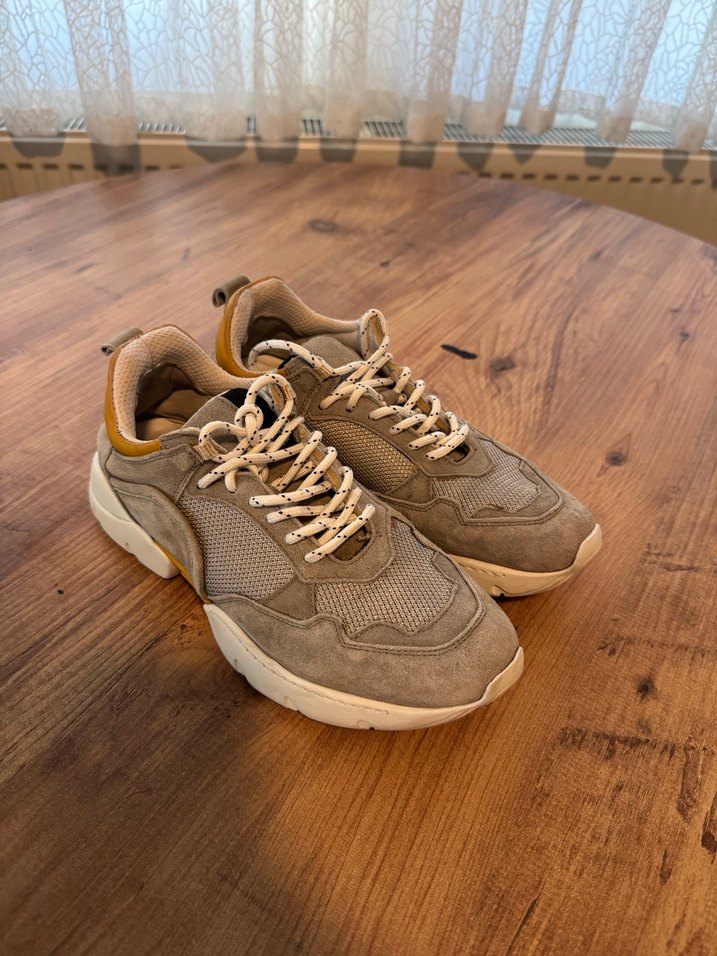 Bej süet malzemeden yapılmış, bağcıklı ve platform topuklu kadın spor ayakkabısı. Sokak stili ve günlük kullanım için uygundur.