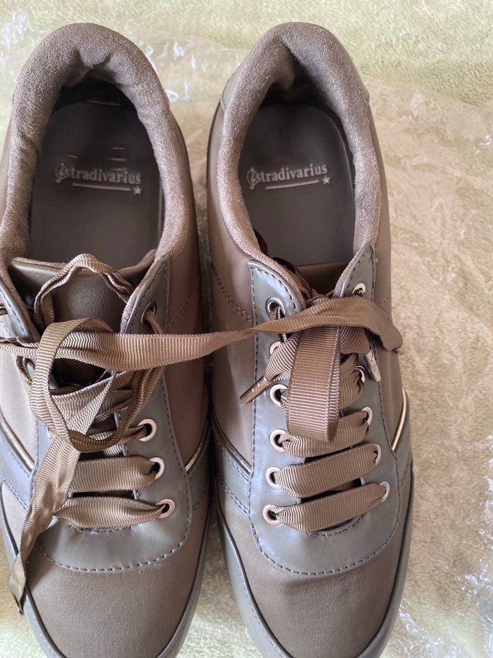 Bej haki karışımı hem spor hem klasik tarzda giyilebilir kadın spor ayakkabısı, Stradivarius markalı, dolgu topuklu günlük ve sokak stili için uygun Saten kurdela bağcıklı ve saten kumaş arka deri detaylı hediye geldi bir kez giyildi çok temiz deformesiz ürün 41 no olsa da kalıbı bir tık dar 39-40.5 olur