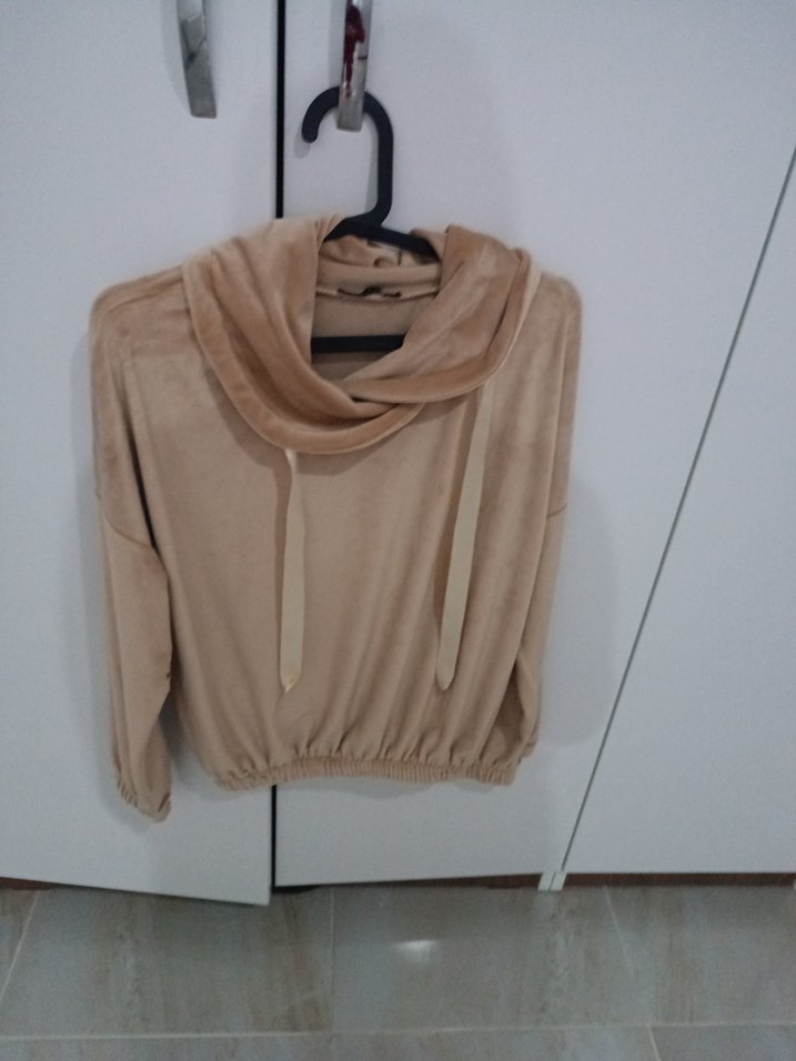 Bej süet kumaştan, yüksek yakalı ve drapeli kadın sweatshirtü. Uzun kollu, salaş ve kısa boyda, elastik bel detaylıdır.