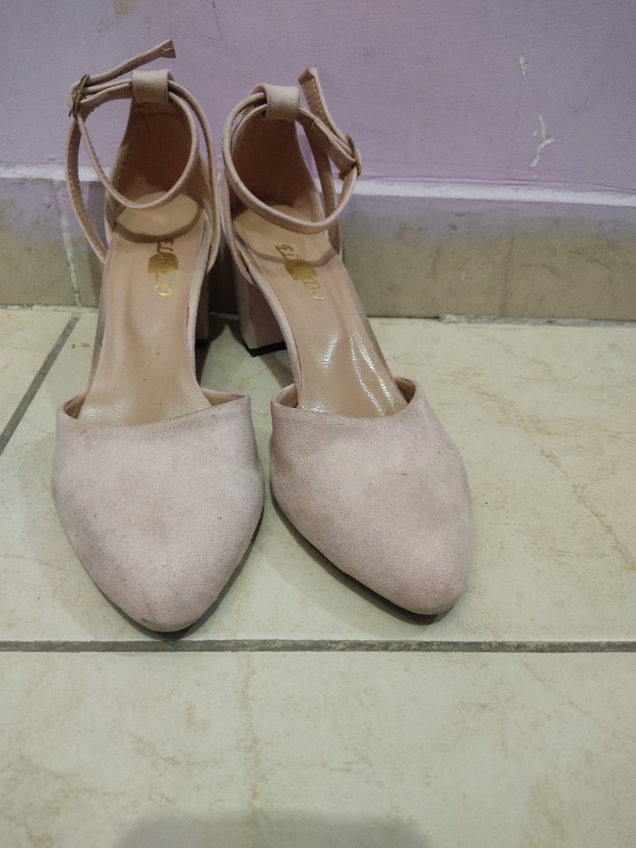 Bej süet malzemeden, tokalı bilekten bağlamalı blok topuklu, minimal ve çağdaş tasarıma sahip abiye kadın ayakkabısı, düğün için uygun.