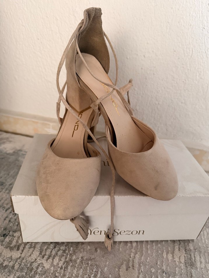 Bej süet malzemeden, blok topuklu ve bilekten bağlamalı kadın ayakkabısı. Paris esintili, romantik akşamlar için şık ve çağdaş bir tasarım.