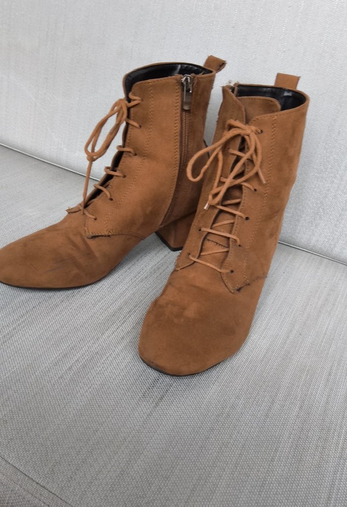 Bej süet kadın botları, kalın topuklu ve kemerli detaylara sahip. Bağcıklı ve yan fermuarlı, minimalist normcore tarz için uygun.