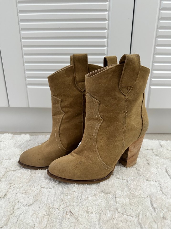 Bej süet kadın botları, kalın topuklu günlük kullanıma uygun rahat bohem stil .