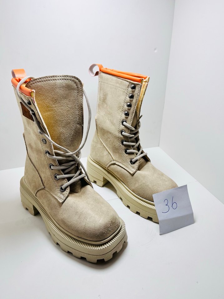 Bej süet malzemeden, stilettolu topuklu kadın botu, sokak stili ve günlük kullanım için uygundur. 36 numara.