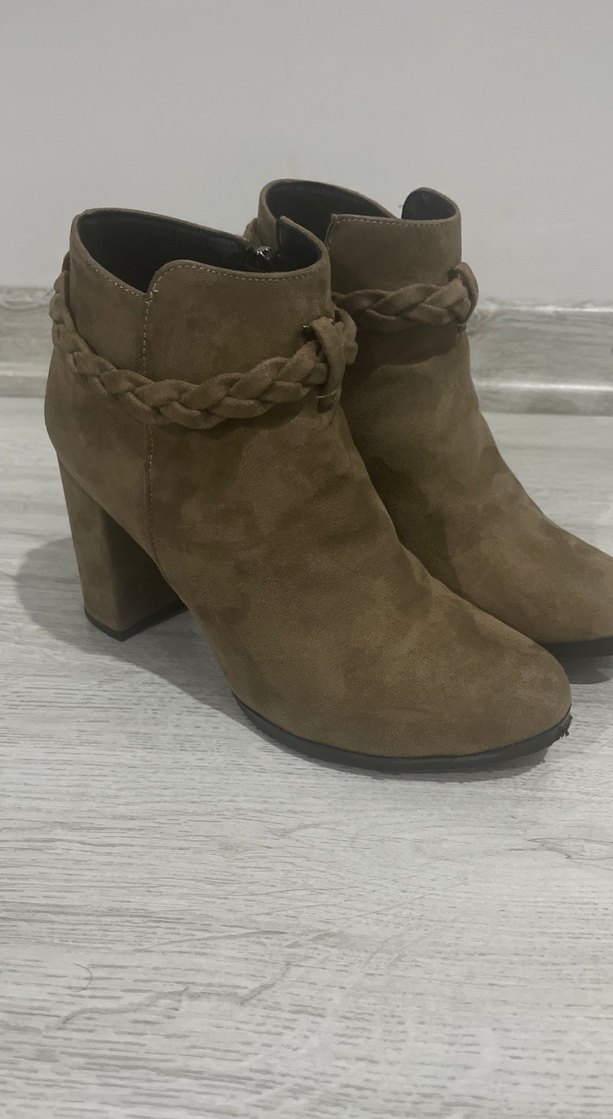 Bej süet kadın botları, blok topuk ve örgülü tokasıyla günlük kullanıma uygun rahat ve modern bir tasarıma sahip.