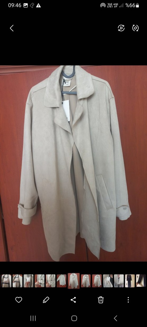 Bej süet trençkot, yakalı ve düğmeli tasarıma sahiptir. Uzun kesim ve rahat kalıpla ofis için uygundur.