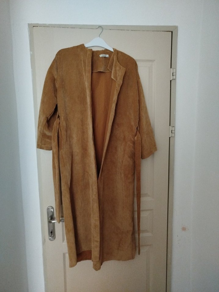 Bej süet kumaştan uzun, salaş kesim kadın kaban. Uzun kollu ve kemerli, minimal tasarımlı, günlük kullanıma uygun, bohem ve retro tarzı yansıtır. Parlak görünümlü.