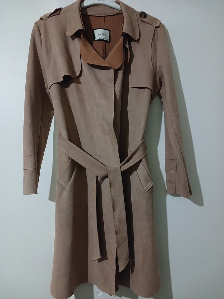 Bej süet kumaştan uzun trençkot, kemerli ve kesimli yakalı. Regular fit ve askılı kollara sahip, günlük sokak modasına uygun.