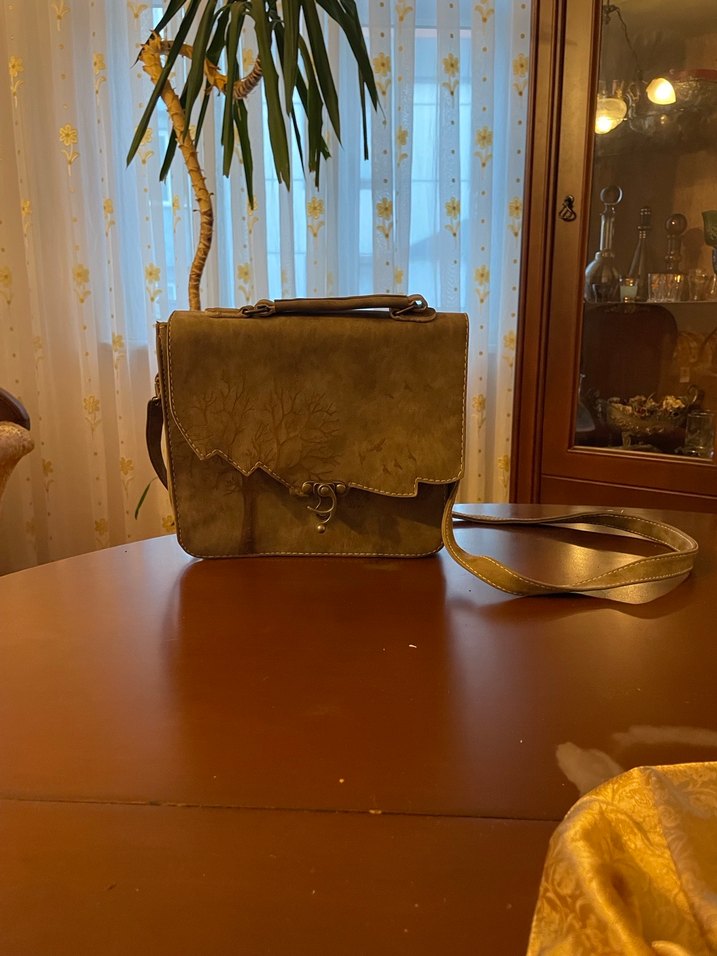 Bej süet kadın çanta, kapaklı ve tokalıdır. Bohem vintage tarzında, elde ve omuzda taşınabilir.