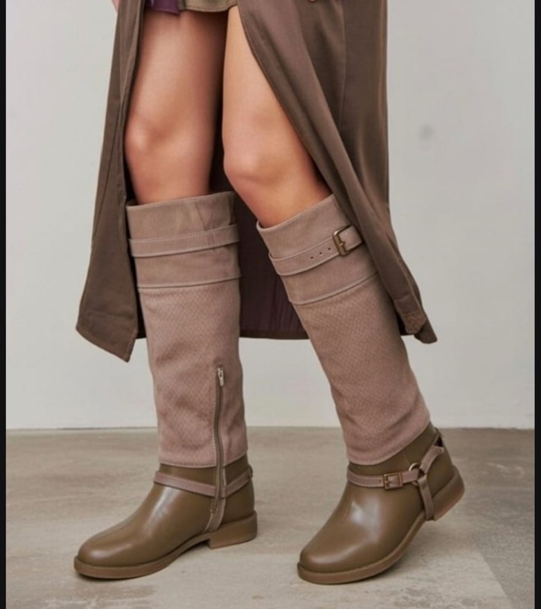 Bej renkli, süet malzemeden üretilmiş, kemerli ve dolgu topuklu dizüstü kadın botları. Rahat ve şık sokak stili için uygundur.