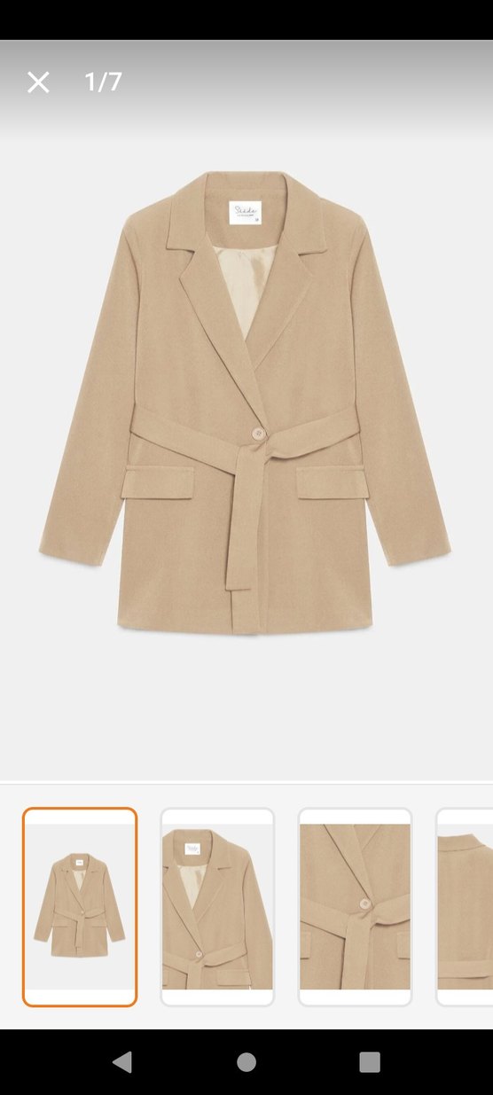 Bej süet kumaştan yapılmış, kemerli ve notched lapel yaka detaylı. Normal boy midi kesim, strappy kollu, desen içermeyen minimalist kadın blazer.