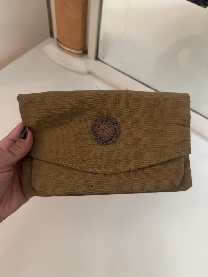 Bej süet malzemeden yapılmış, kemerli ve desen içermeyen kadın clutch cüzdan. Minimalist ve retro tarzıyla günlük kullanıma uygundur.