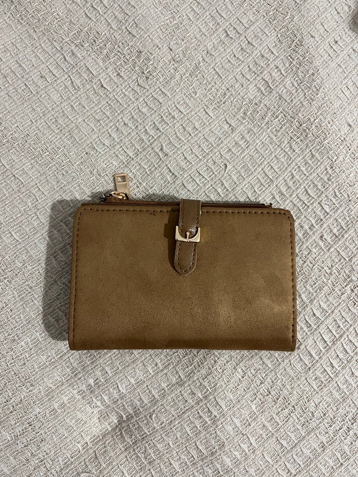Bej süet kumaştan kemerli kadın cüzdanı, modern klasik tasarıma sahip, günlük kullanıma uygun. Düz yüzeyi zarif bir görünüm sunar.