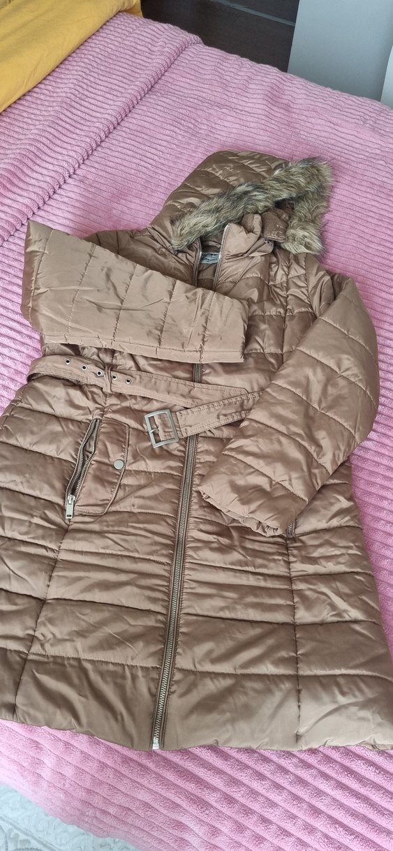 Bej süet kumaştan kemerli, fitted kesimli kadın kışlık mont. Notlu yaka ve askılı kollu, midi uzunlukta, günlük kullanıma uygun rahat ve şık tasarım. ❄️