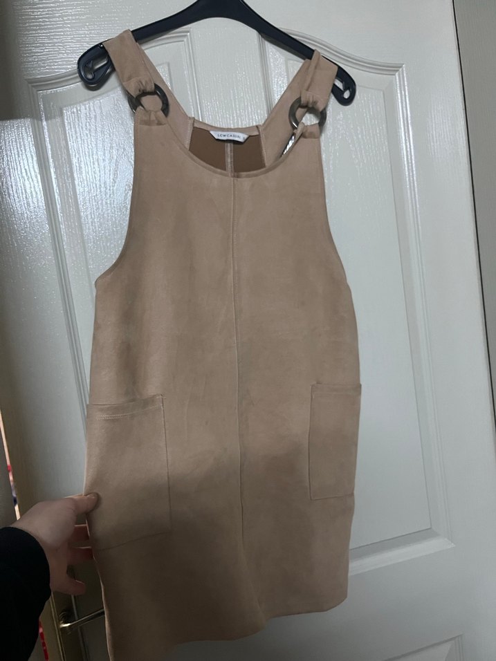 Bej süet kumaştan, kemerli ve cep detaylı, salaş kesim midi tulum. Kolsuz ve bisiklet yaka, günlük sokak stiline uygun.