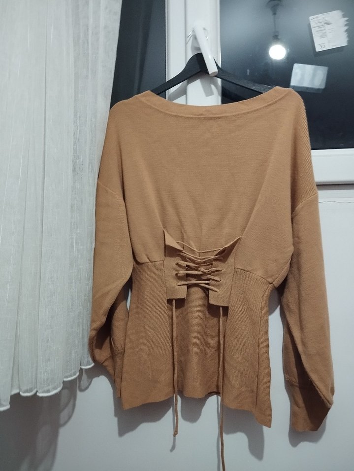 Bej süet kumaştan, uzun kollu, kemerli ve salaş kesim kadın triko. Midi boy ve düz renk, günlük kullanım için uygundur.