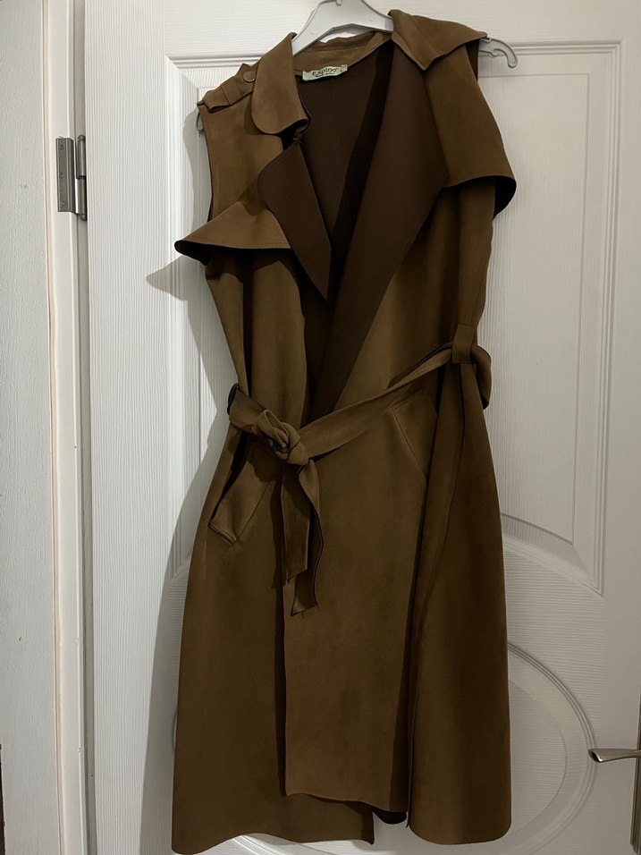 Kemerli, kolsuz, bej süet uzun yelek. Notch yaka ve regular fit ile günlük kullanıma uygun, sokak modasına uyumlu.