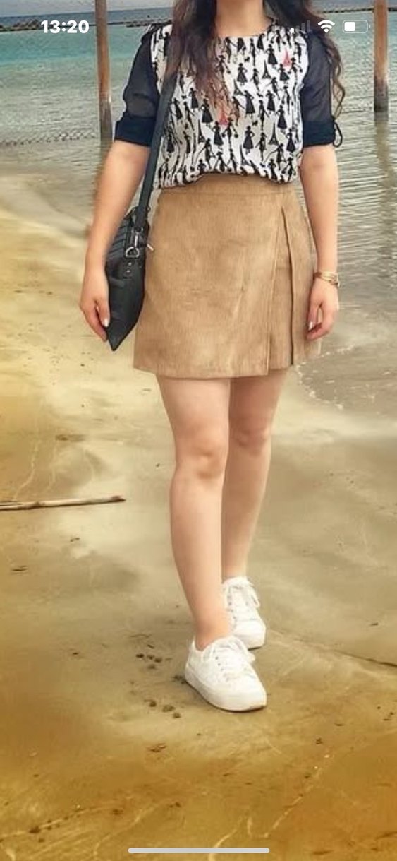 Bej süet kumaştan, kemerli ve bol kesim mini şort etek. Günlük kullanım için uygun, desen içermeyen sade tasarım, normal boyda. Koton marka sadece 1 kez kullandım