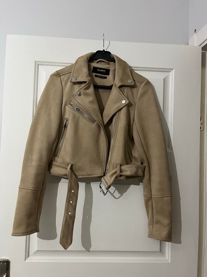 Bej renkte, kemerli, süet deri ceket. Notlu yaka, dar kesim ve askılı kollarıyla günlük sokak stiline uygundur. Az kullanıldı temiz